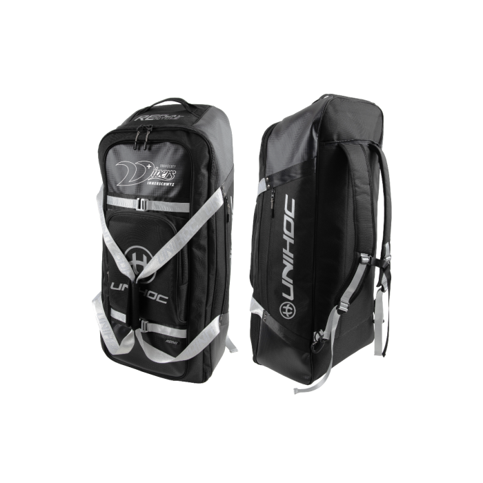 Voluminöser Spezialrucksack von UNIHOC aus der Taschenserie RE/PLAY, bei der 80% des Materials aus recyceltem Polyester hergestellt wurde. Speziell für Torhüter entwickelt, welche viel Ausrüstung mit sich tragen. Mehrere Aussen- und Innentaschen mit Reissverschlüssen. Die Tasche hat auch zwei normale Griffe für die Verwendung als grosse Sporttasche. 100 L Volumen.